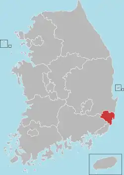 ![]() တောင်ကိုရီးယားနိုင်ငံ မြေပုံ (အောလ်ဆန်ကို အနီရောင်ဖြင့်ပြထားသည်) | |