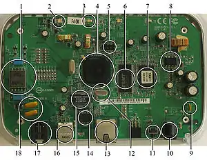 A router, an example of an embedded system. Labelled parts include a microprocessor (4), RAM (6), and flash memory (7).