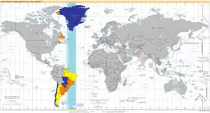 - Saint-Pierre and Miquelon (လောင်ဂျီကျူမျဉ်း 56°12′W တွင်တည်ရှိနေပြီး သက်ဆိုင်ရာအချိန်မှာ UTC-03:44)